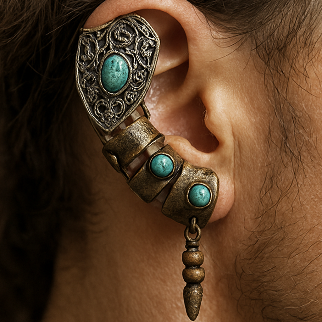 Bohemian jewelry: Men's full-coverage ear cuff, eclectic Bohemian. Oxidized silver filigree shield at helix, connecting to articulated armored structure down the ear. Hammered metal, aged bronze, raw turquoise cabochons. Rugged dangling charm, small wooden beads at lobe. Aged, rustic, artisanal.