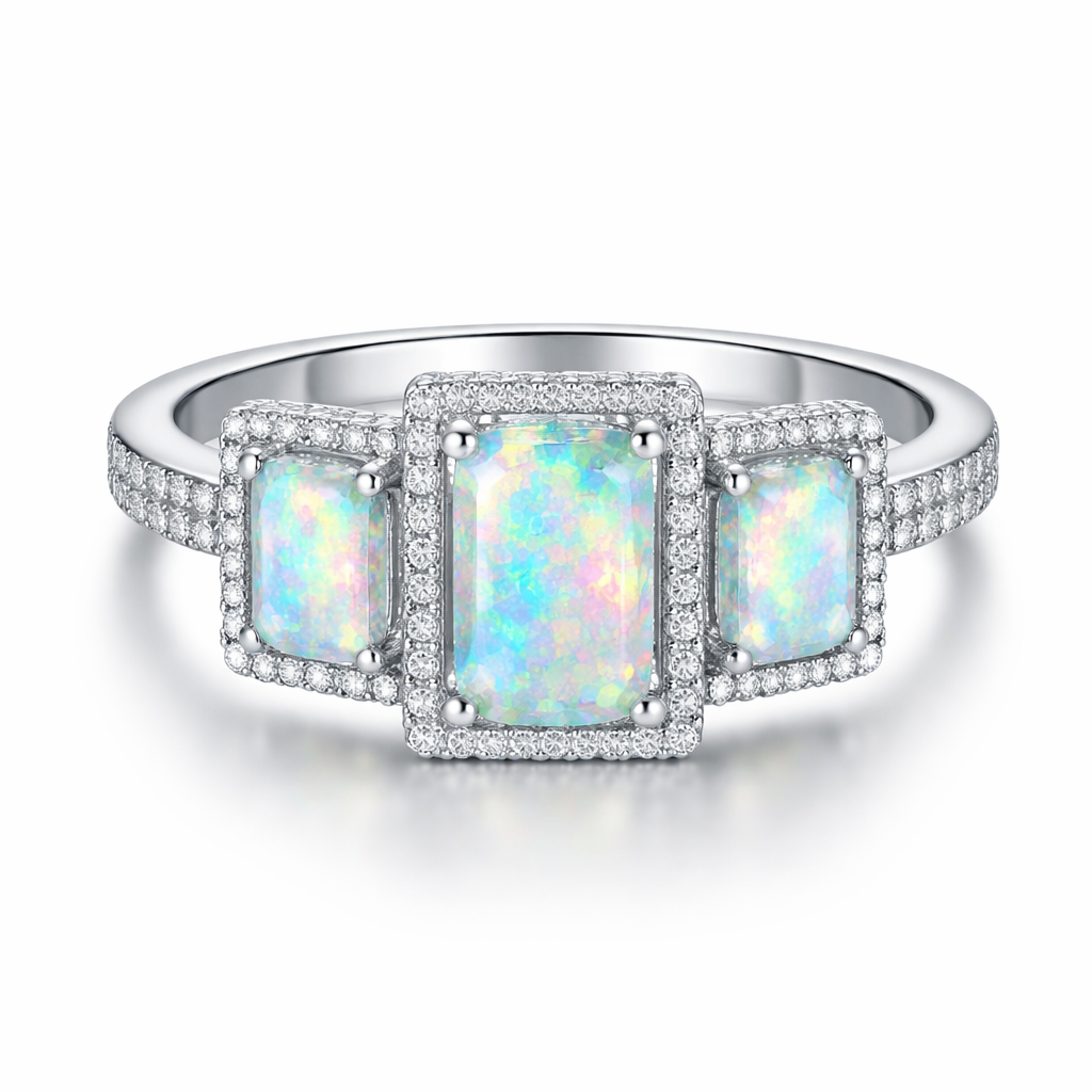 A modern women's ring made of silver with opal stones suitable for daily wear. a 3 rectangle shape with diamond all around with big stone in the middle