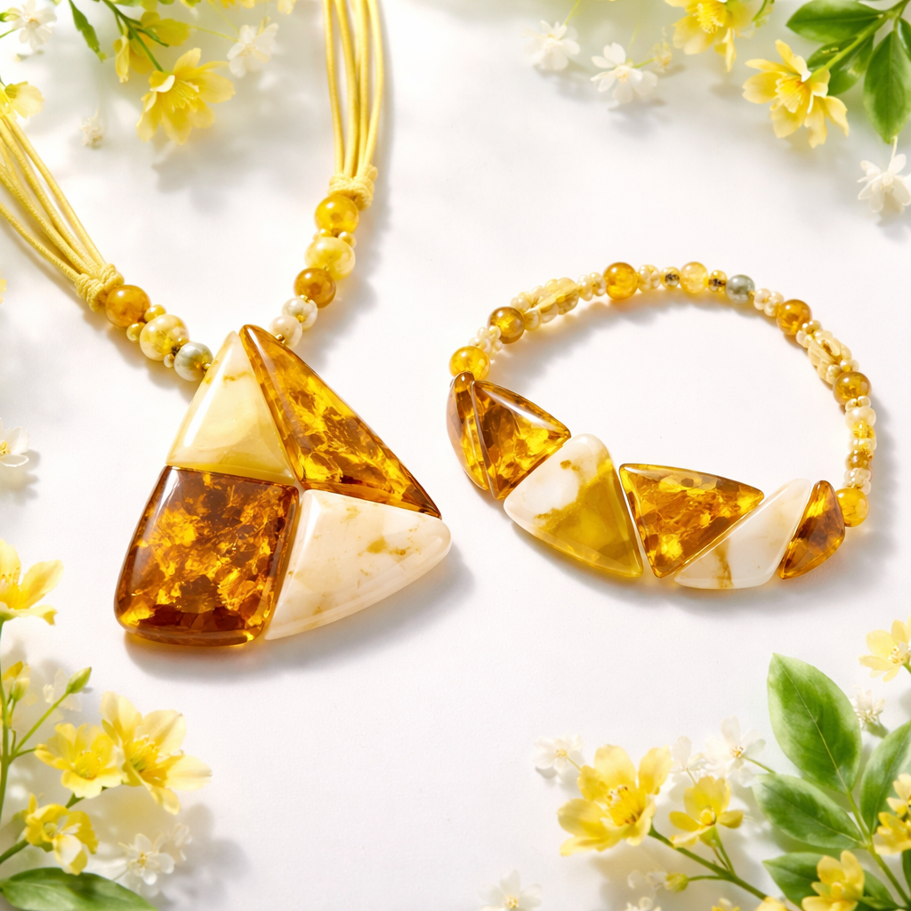 Tik gintaro karolis ir apyrake moteriai, geltona balta su idomiu dizainu be metalu pavasarines nuotaikos trikampio forma, modern style