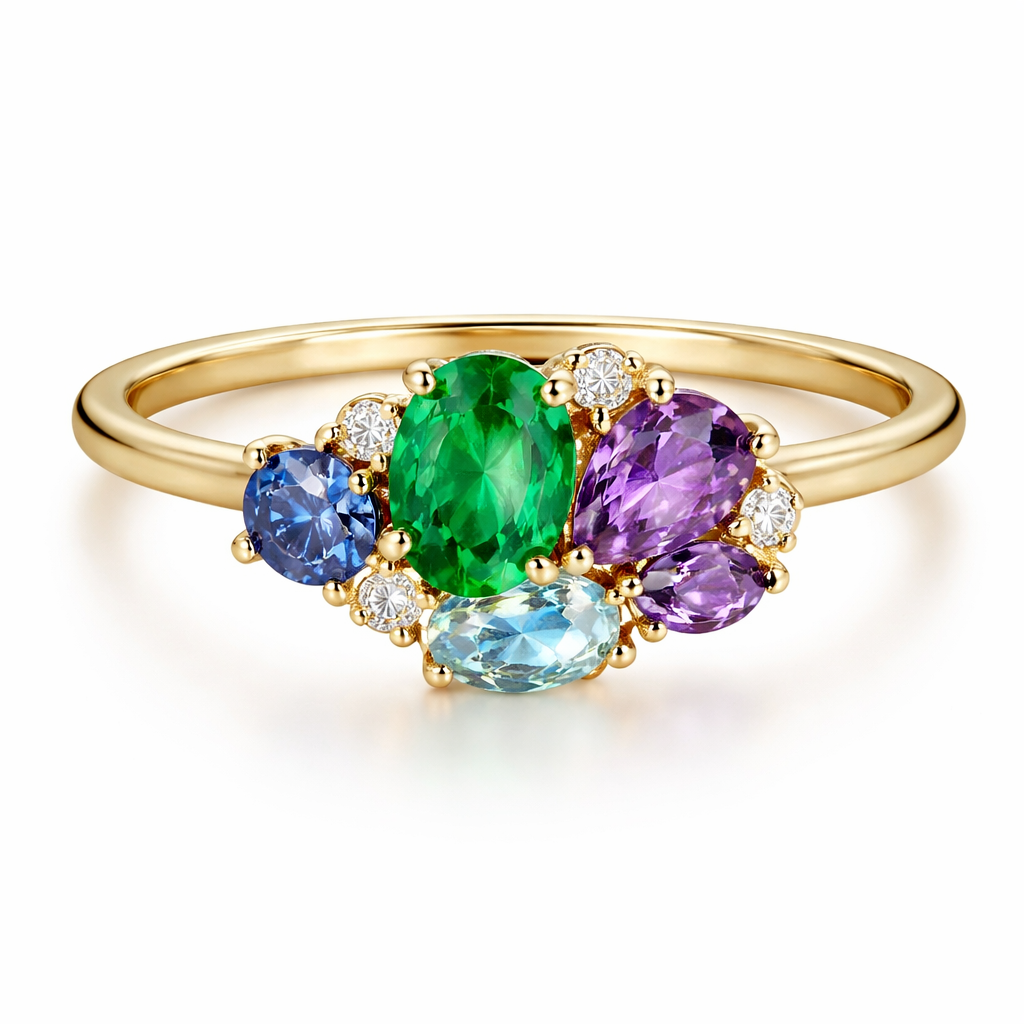 Create a delicate asymmetrical cluster of gem stones including 1 emerald,1 blue sapphire, 2 amethyst , 1 blue topaz use different shapes. yellow gold band with gold prongs. sprinkle in some diamonds and focus on the emerald being in the center as one of the larger stones and one of the amethyst also being towards the center as one of the bigger stones and the other three stones are the children’s stones that can be a little bit smaller, minimalist style