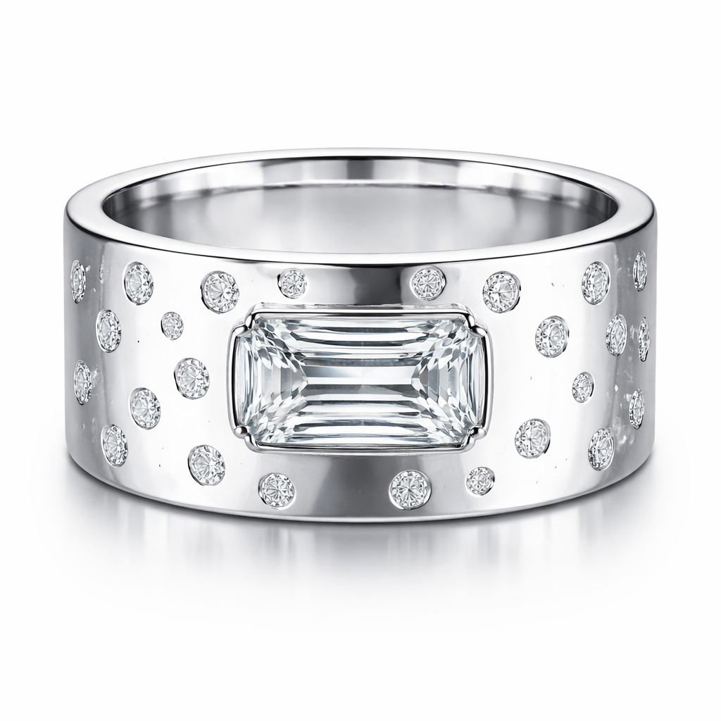 Extra wide white gold band with horizontal emerald cut diamond with 20 scattered small round diamonds