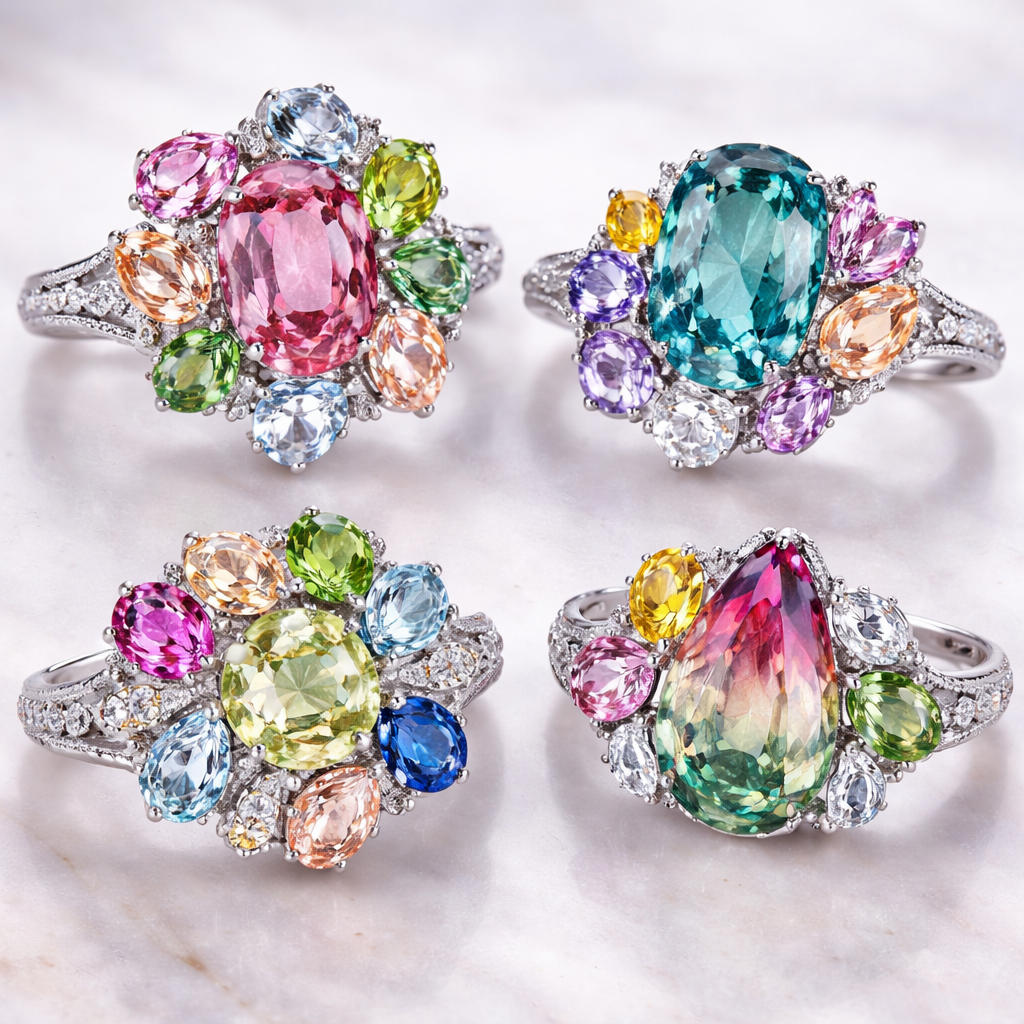 Colour natural coloured gemstones different shapes in white gold, bespoke style
