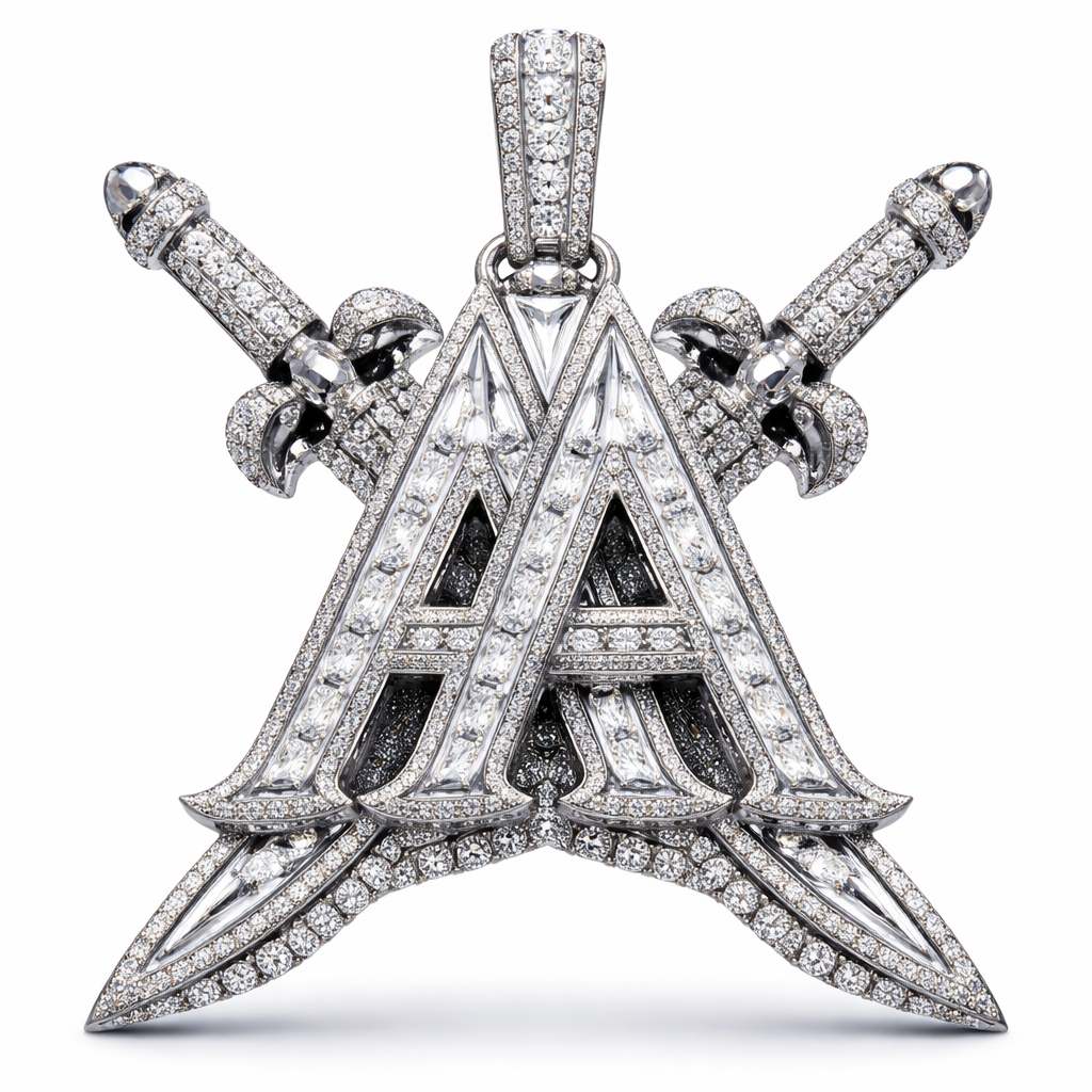 3.5 inch pendant with 2 A’s with 2 crossed swords out of the 2’A VVS DIAMOND BAGUETTE DIAMOND The Pendant: The pendant features a "one-of-a-kind" design with a mix of . also features unique pyramid-cut jewels and an elevated structure. The piece is flooded with high-quality, brilliant-cut diamonds. The style generally consists of thick, wide, 14k-18k white or rose gold Cuban links completely flooded with VVS natural diamonds. The style generally consists of thick, wide, 14k-18k white or rose gold Cuban links completely flooded with VVS natural diamonds. , vintage style