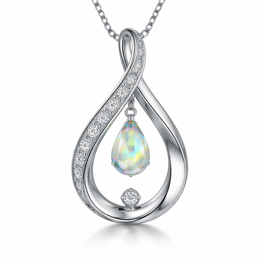 One carat white oval opal with pink diamonds surrounding in rose gold with yellow gold dangling diamond chain