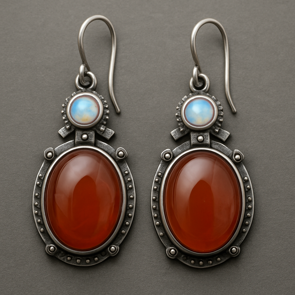 Carnelian oval stone, silver earrings with round opal accent, steampunk style