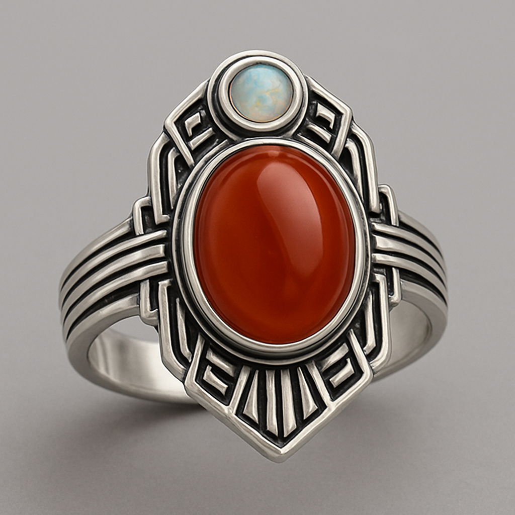 Carnelian oval stone, silver ring with round opal accent, art_deco style