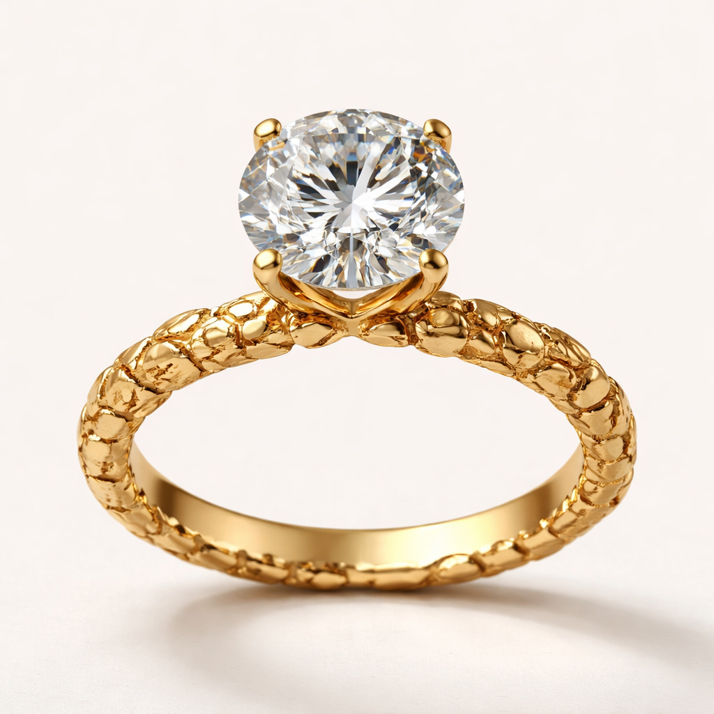 Yellow gold nugget ring with a 3ct round brilliant diamond solitaire that is propped up