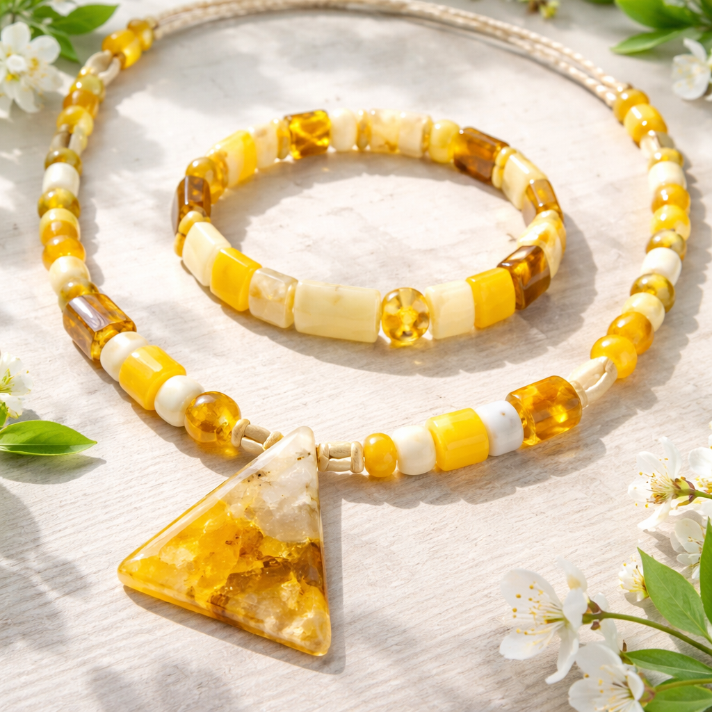 Tik gintaro karolis ir apyrake vyrui, geltona balta su idomiu dizainu be metalu pavasarines nuotaikos trikampio apskritimo staciakampio forma