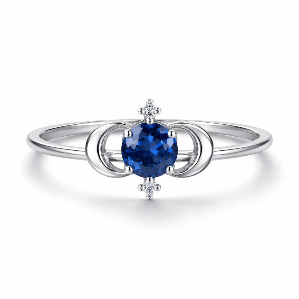 A minimalist women's ring made of silver with sapphire stones. anel com pedra central redonda e duas luas ao redor dela. pedras transparentes em cima e embaixo simulando estrelas, minimalist style