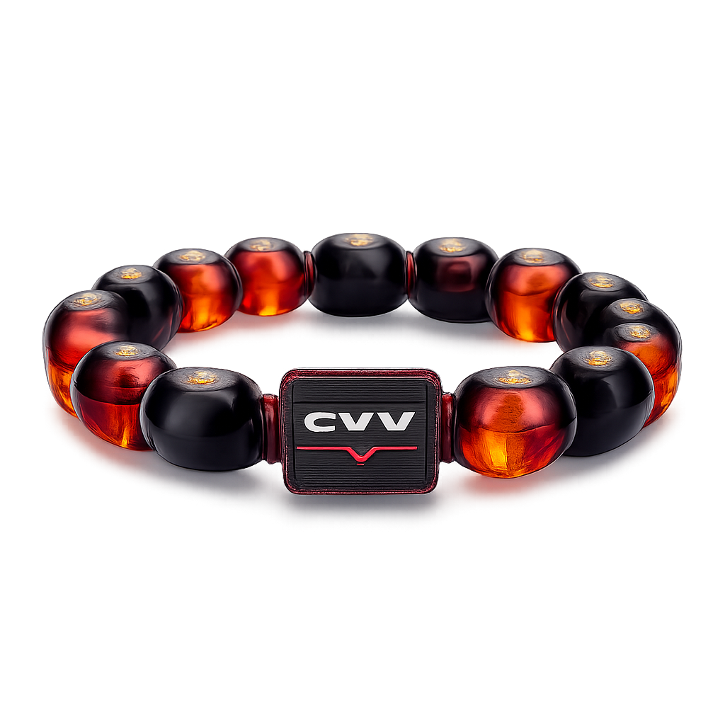 Only amber stones red and black bracelet sports style EVW sports logo for man sguare in the centre simply visually recognising , minimalist style
