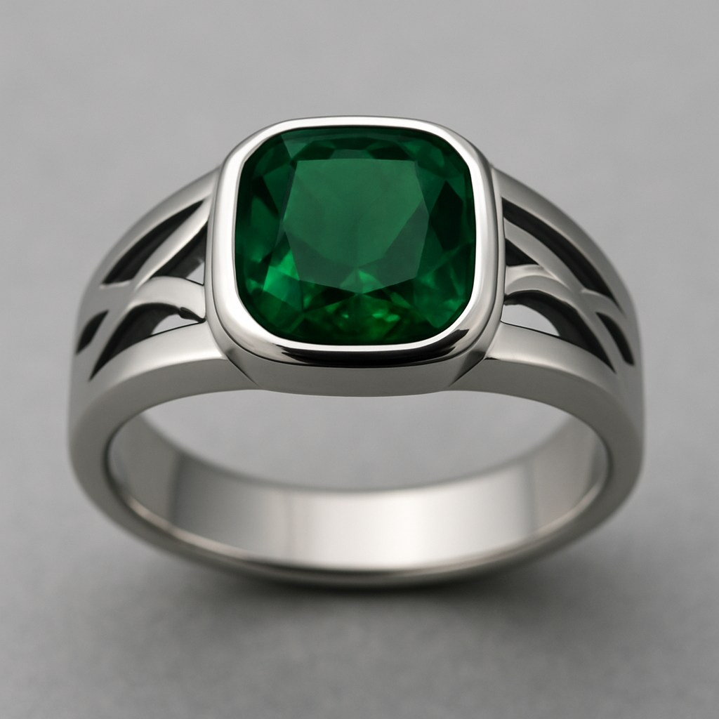 Create a design for a ring. Green stone in the middle with crafted on the side , modern style