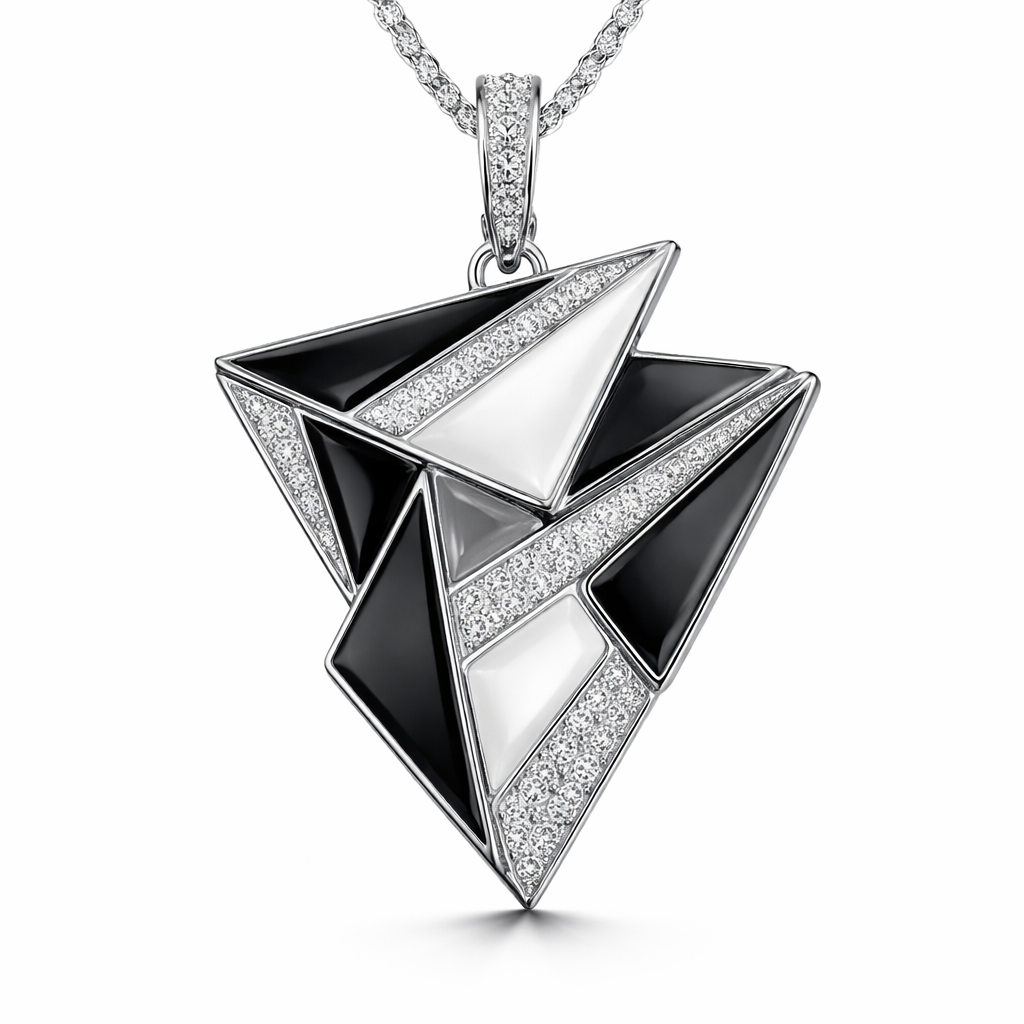Geomatric pendant of angles shape of different shapes and egdes woth gray and white and black enamel and diamonds