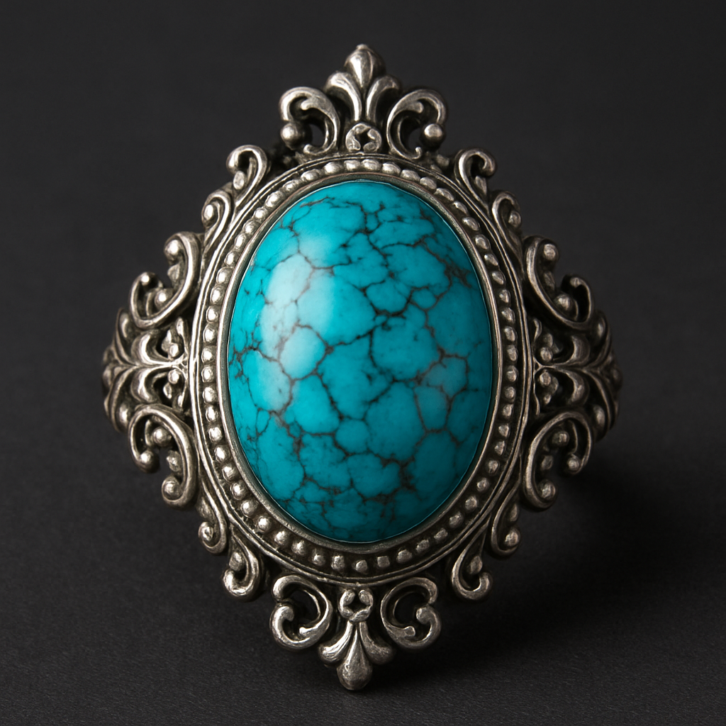 Diamond ring with a smooth heart-shaped stone. The ring is round and features small diamonds.