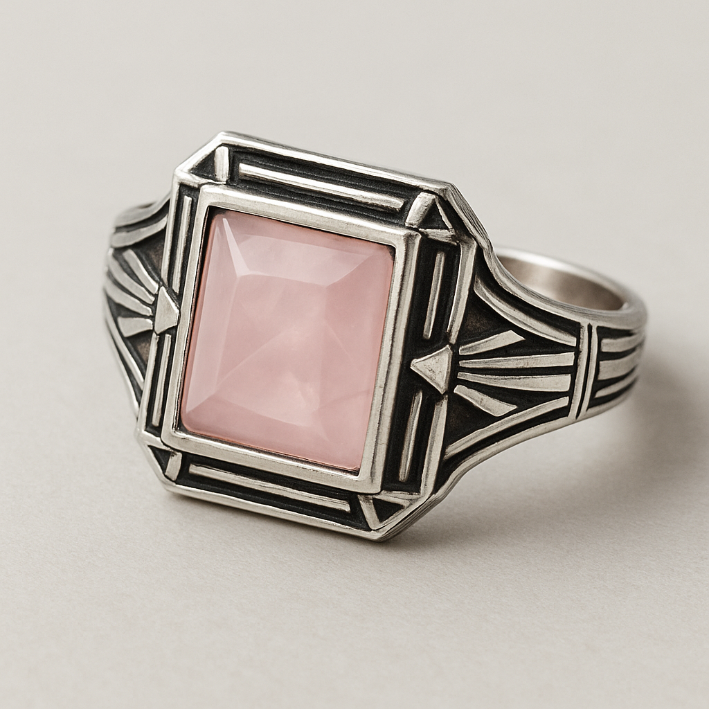 خاتم مربع من فضه بحجر كوارتز الوردي تصميم عصري , art_deco style