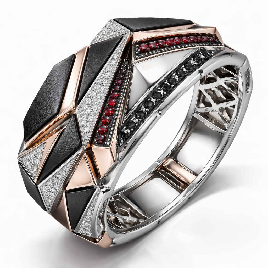 Modern bangle adding leather Geomatric shape and architecture shape and voulme of edgy style of bracelet with diamonds and black diamonds and rubybof white background