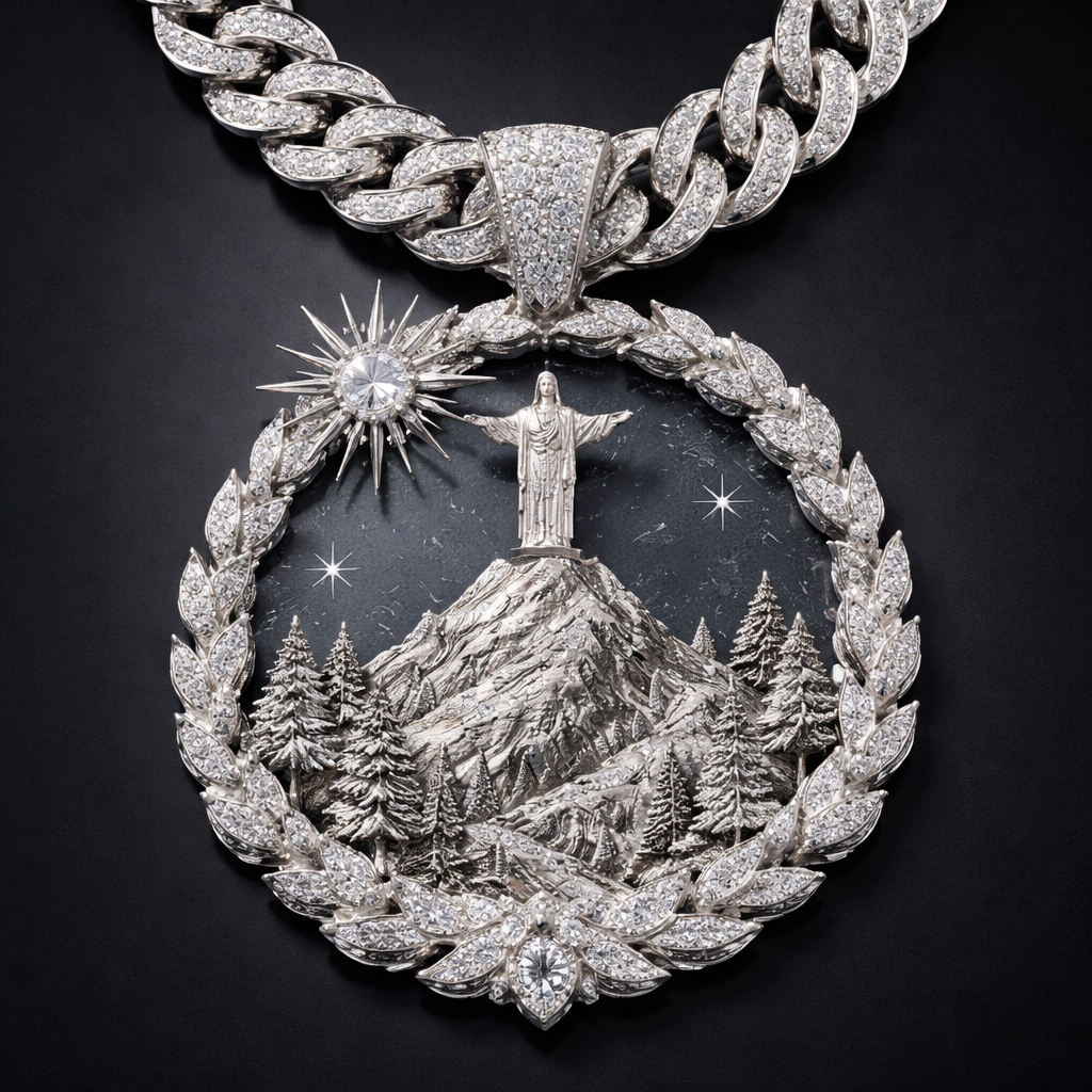 A nature men's necklace made of white gold with diamond stones. I want a pendant out of the picture 3D of Mt cristo rey with a diamond Cuban link all in white gold, nature_inspired style