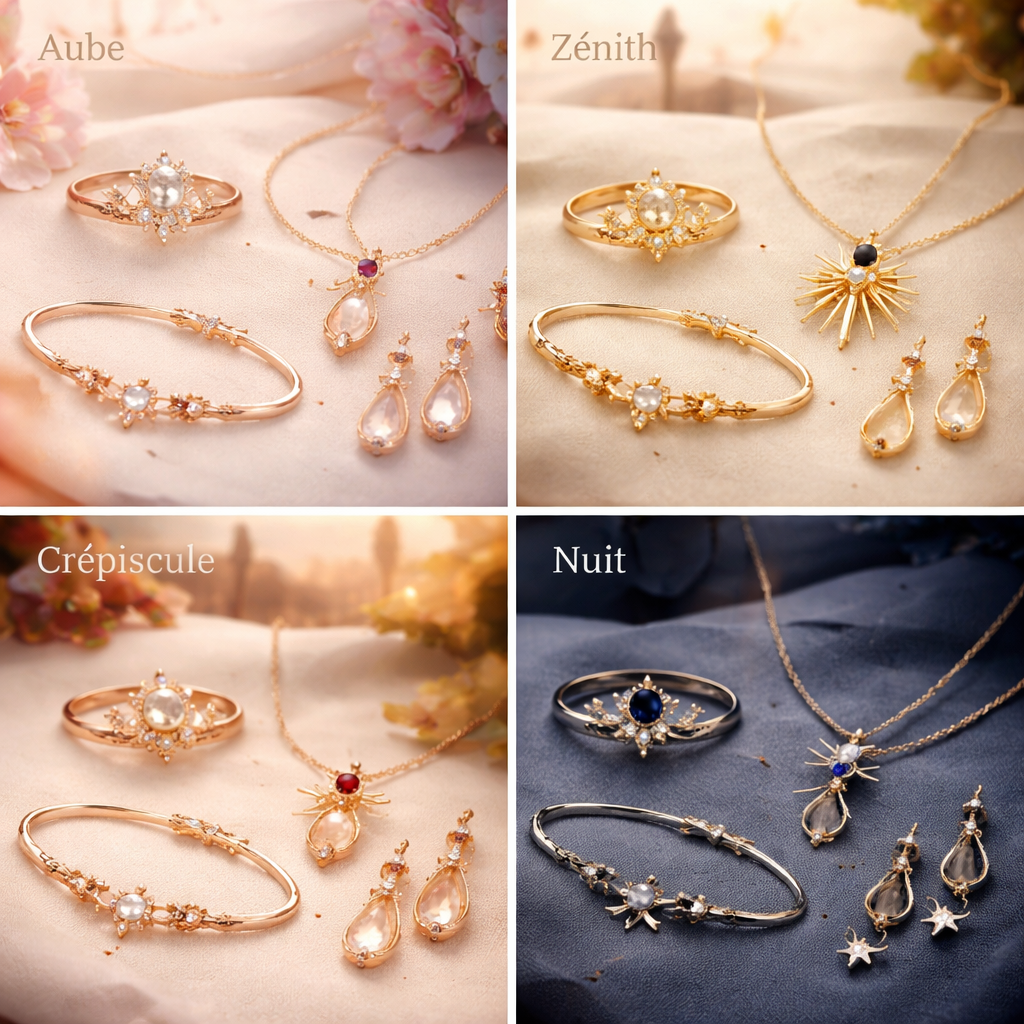 Crée une collection de bijoux inspirée par les moments de la journée à Paris. La collection comprend quatre types : une bague, un collier, un bracelet et des boucles d’oreilles. Chaque type de bijou a quatre variations : l’aube (couleurs douces, finesse lumineuse), le zénith (éclat doré, forme élégante), le crépuscule (tons chauds, ambiance apaisante) et la nuit (motifs mystérieux, couleurs profondes). Chaque bijou doit être fin, délicat et minimaliste, capturant la poésie de ces moments.