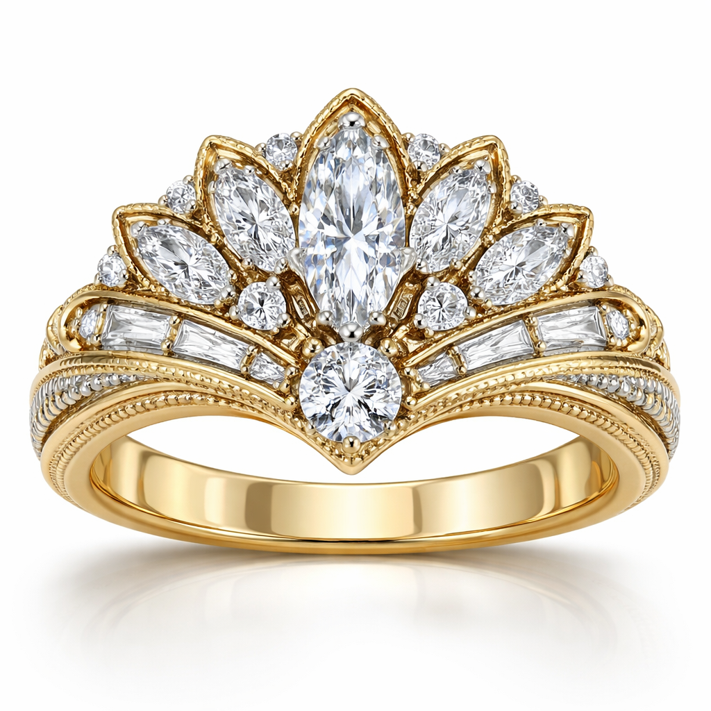 .6 karat marquise centered, with .25 round directly under it with 6 more smaller marquise diamonds and 2 .15 round diamonds mounted on a wide 14k yellow gold band. Make the design in a fan shape and use platinum prongs add some baguette diamonds also this is the exact size of the 6 smaller marquise stones and the baguette stones , victorian style