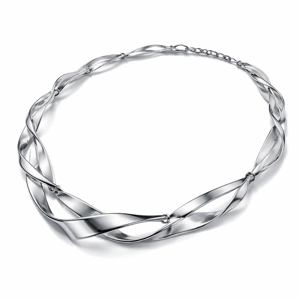 A flexible necklace that has links and articulations that inspired by a twisted flat wire and its light weight, modern style