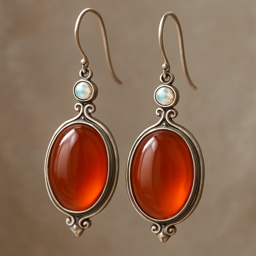 Carnelian oval stone, silver earrings with round opal accent, romantic style