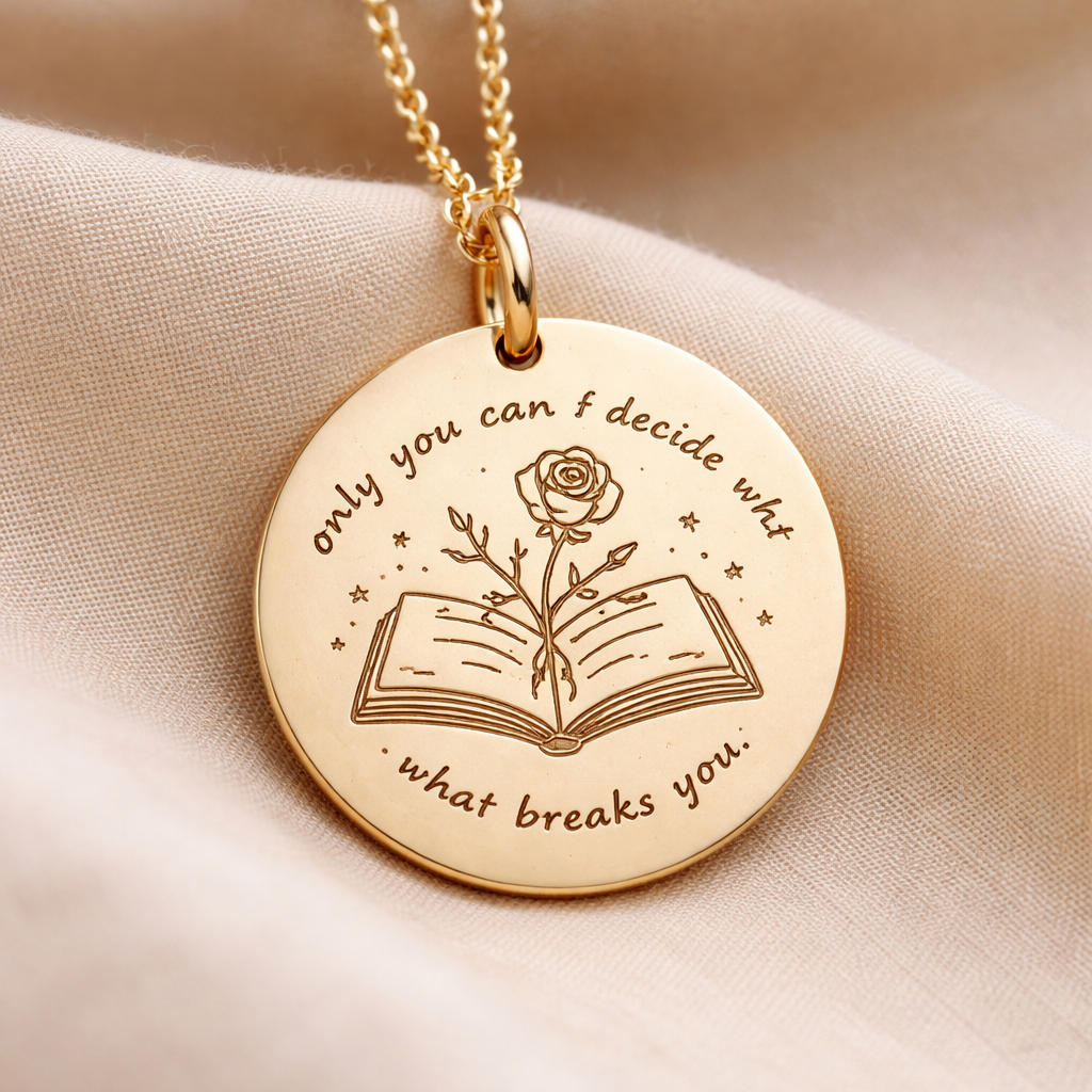 A minimalist women's pendant. um pingente que tenha o símbolo do livro de corte de espinhos e rosas com o quote da imagem
