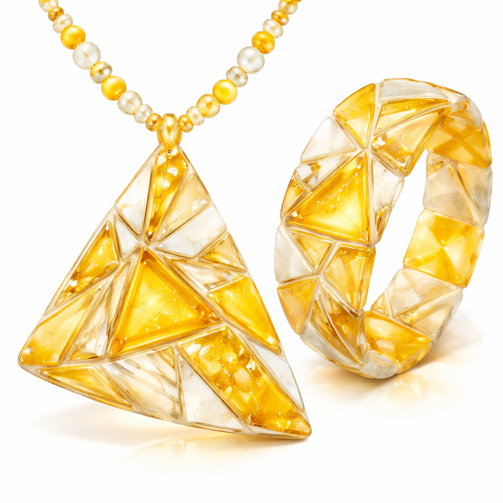 Tik gintaro karolis ir apyrake moteriai, geltona balta su idomiu dizainu be metalu pavasarines nuotaikos trikampio forma, art_deco style