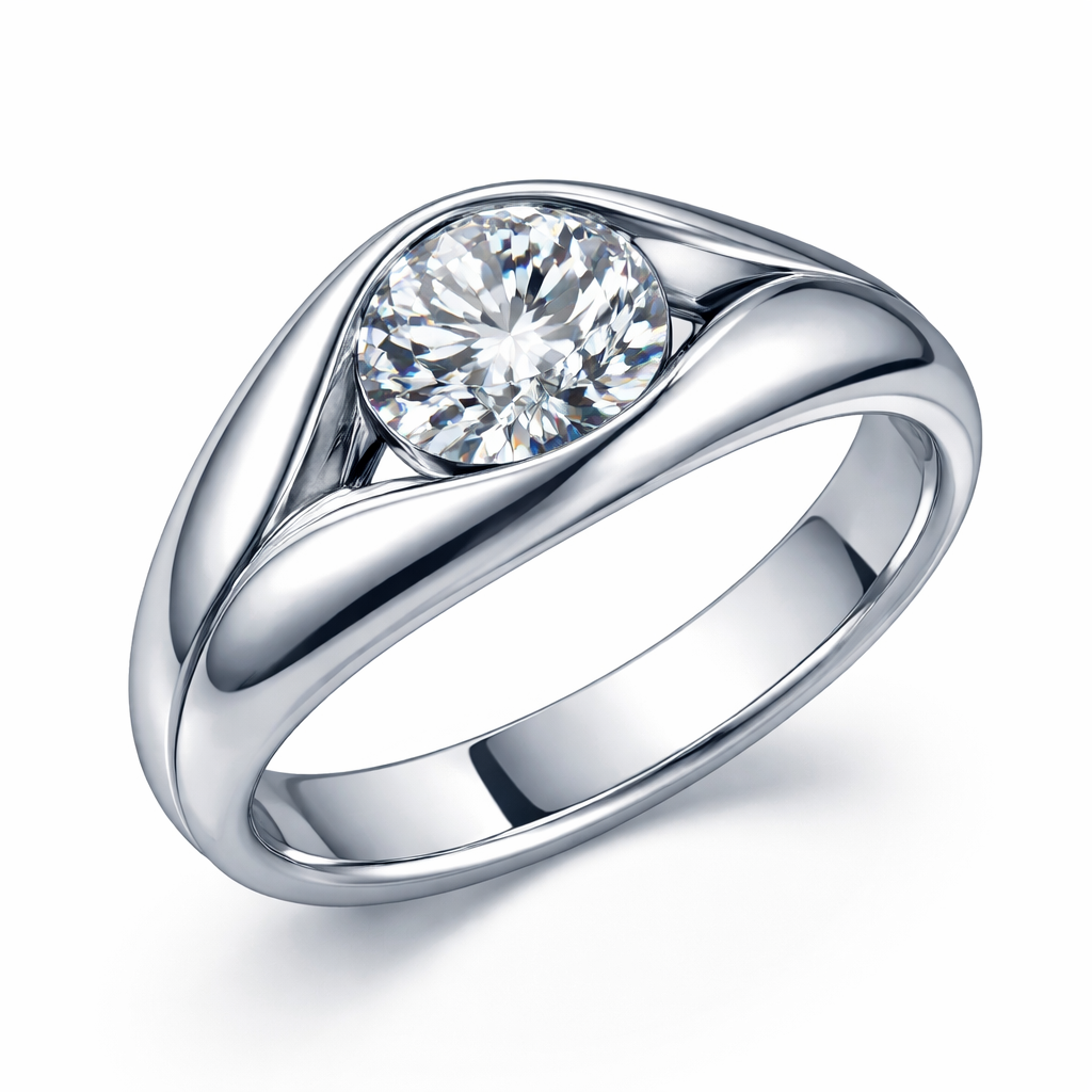 A modern women's ring made of platinum with diamond stones. diamond ring with a signet style look metal flowing up and around diamond with diamond set flush into ring, modern style