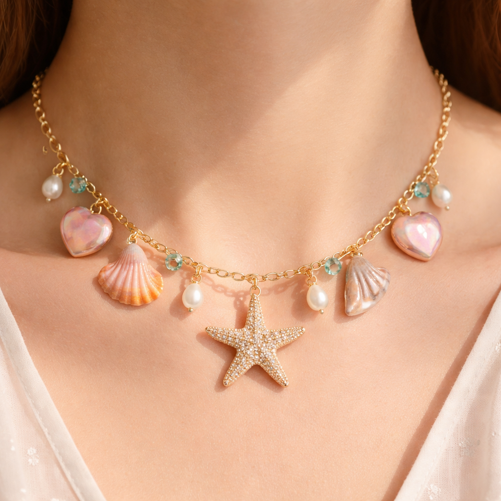 Can you ad a necklace that has a seastar on it and shells and harts, modern style