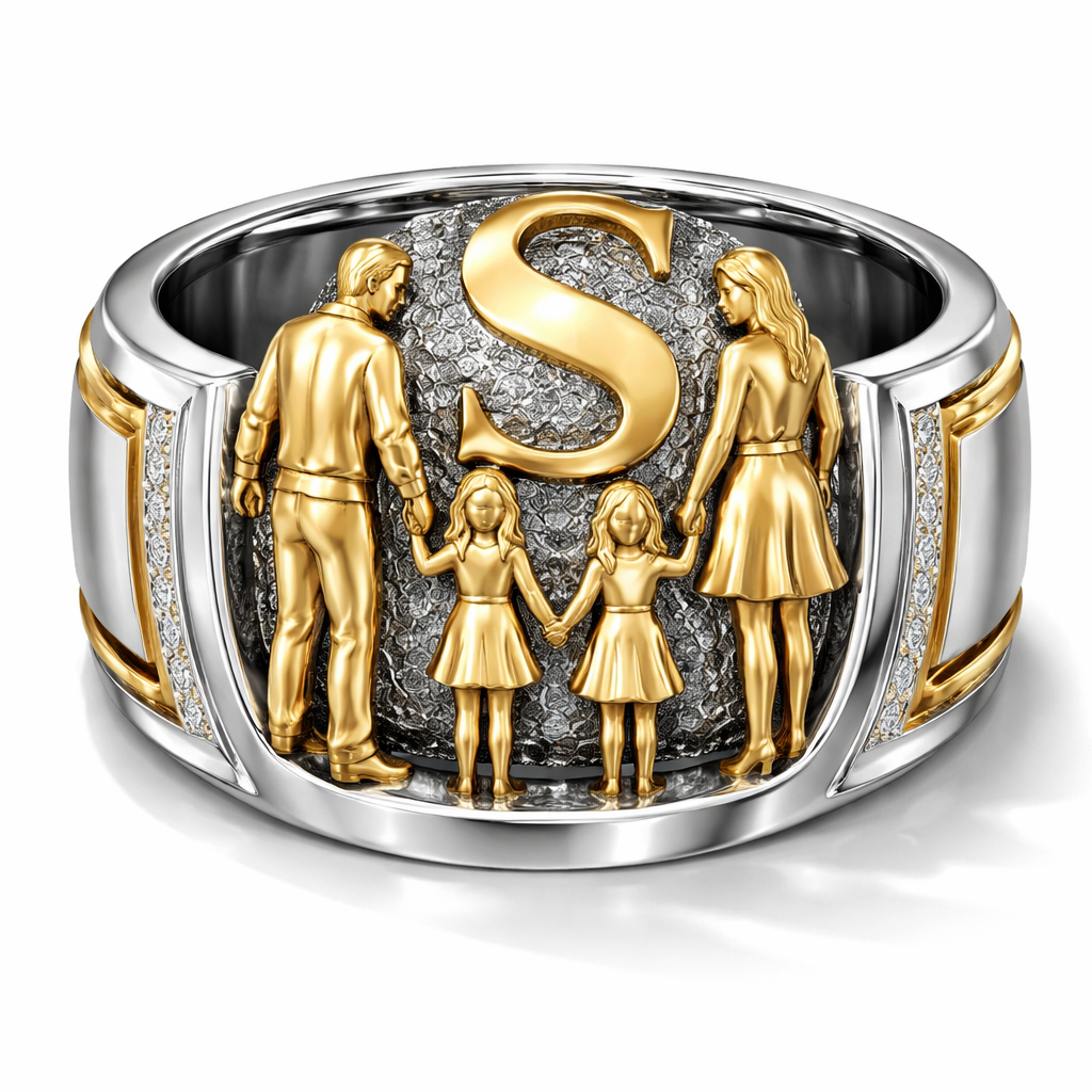 A women's ring. Anillo para hombre con una mano de papa, mamá y 2 niñas pequeñas sujetandose y una letra S atras, modern style
