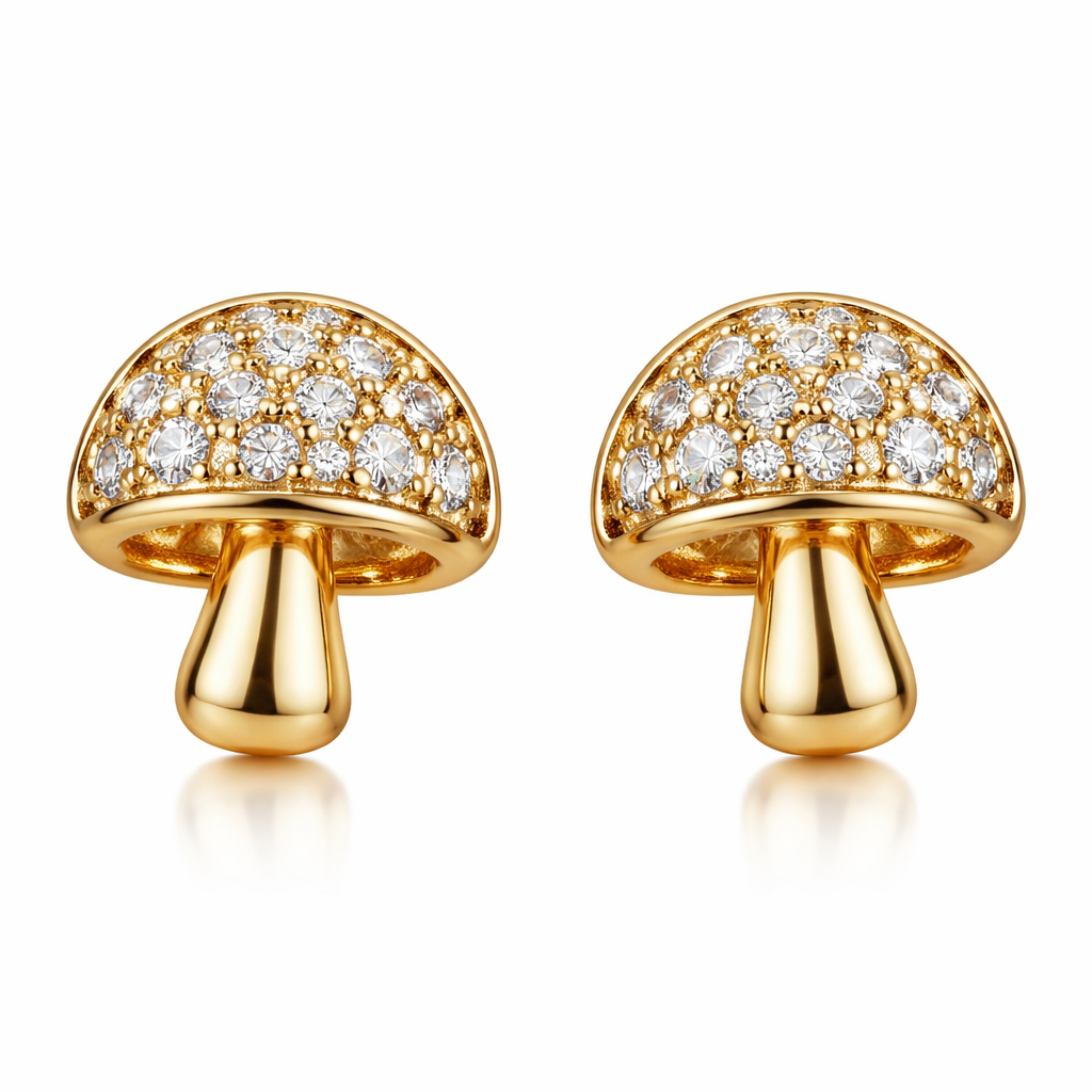 Aretes en forma de hongo, de tamaño pequeño y con diamantes en la parte circular del hongo, es completamente dorado