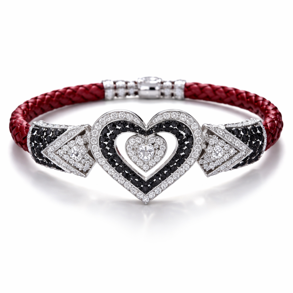 Geomatric bangle of heart of ede style and shape white black diamonds of love shape of little bit of stones and chain of red leather