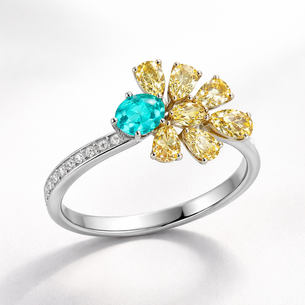 A women's ring. 7粒水滴小黃鑽石和40份帕拉伊巴