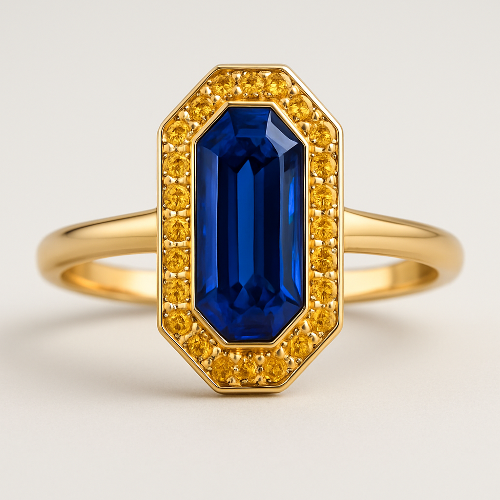 Yellow gold metal, 1.5ct elongated hexagon sapphire center stone, add a halo of small citrines, tapered band