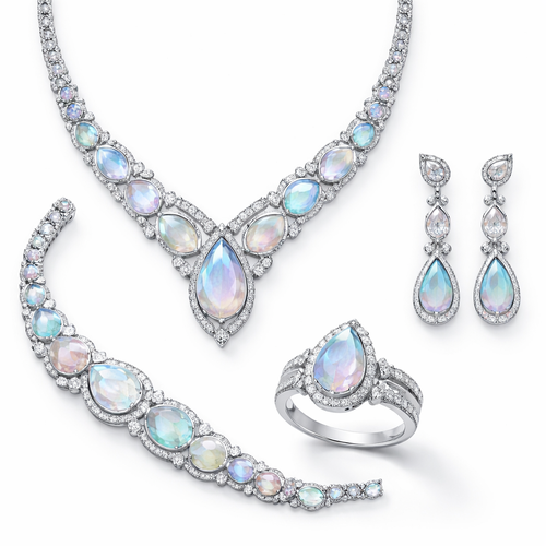 طقم كامل من قلاده واسواره وخاتم وحلق بتصميم عصري ناعم وفاخر بلامسات جديده مختلفه وغريبه مصمم من معدن الفضه مع احجار كريم...