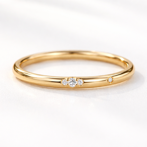 A highly detailed minimalist gold band ring with a thin and delicate profile (about 1.5–2 mm wide). The ring has a soft ...
