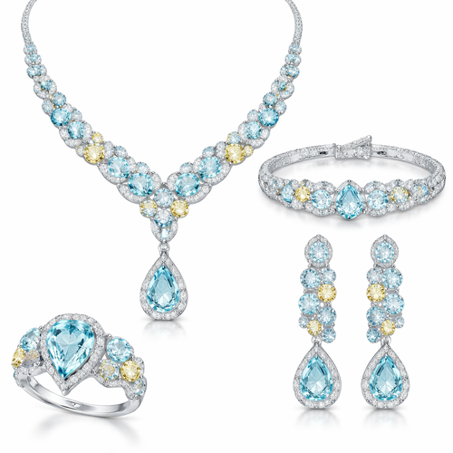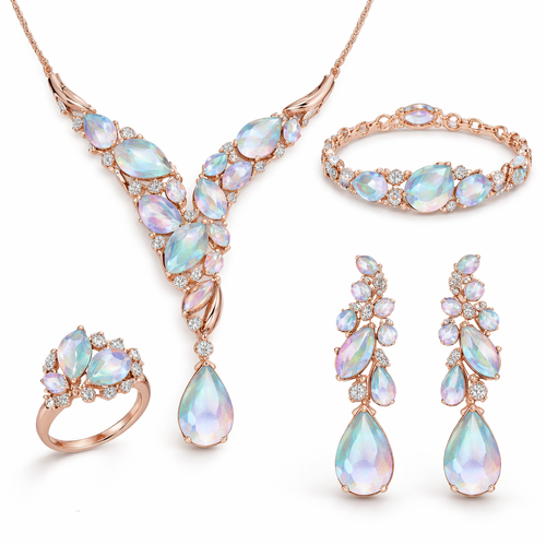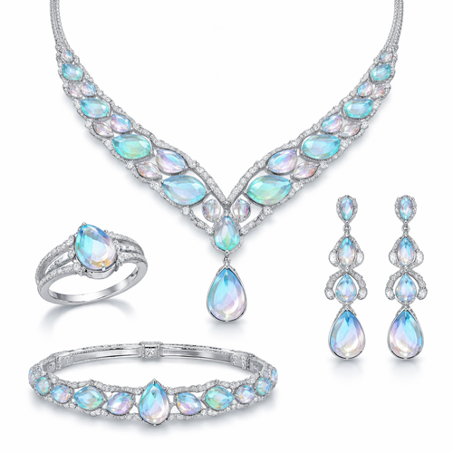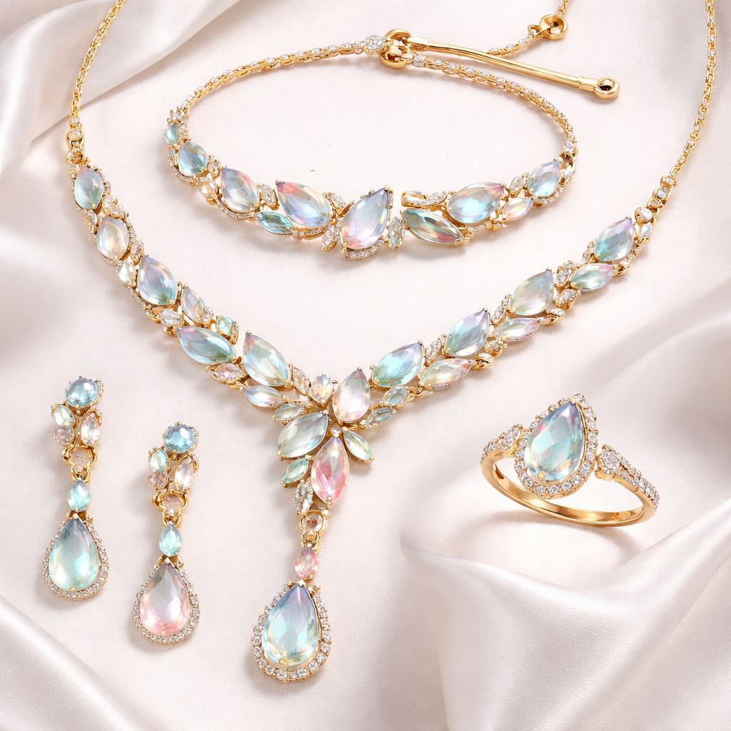 طقم كامل من قلاده واسواره وخاتم وحلق بتصميم عصري ناعم وفاخر بلامسات جديده مختلفه وغريبه مصمم من معدن الفضه المطلي بالذهب مع احجار كريمه بالوان فاتحه مدرجه سماويه متجانسه اكثر يناسب البنات