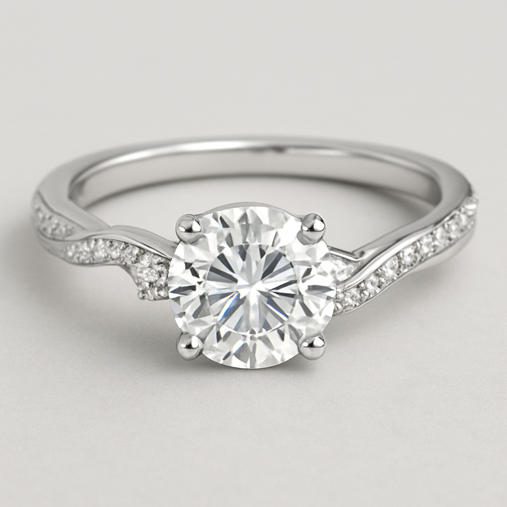 Round 3carat solitaire with a .6 carat inset diamond on each side and twist pave band , modern style
