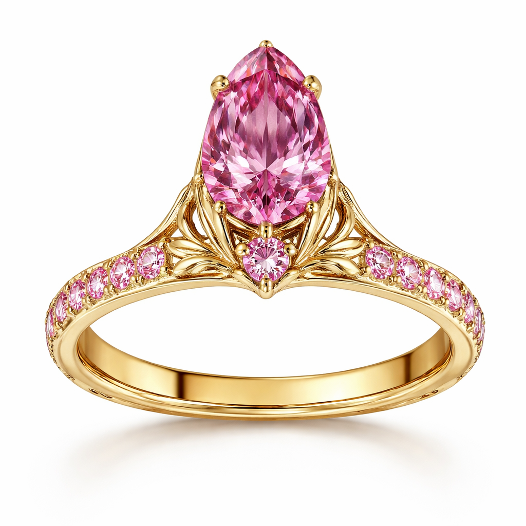 a pink sapphire elongated pear about 3ct in a gold cathedral tulip band setting with 0.50ct pink sapphire in the middle of the cathedral with a pink pave halfway down the ring, romantic style