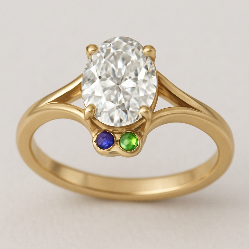 This is an engagement ring. I’d like a gold band and hidden halo setting with an oval diamond, no more than 2ct. Hidden beneath the setting, I’d like embedded amethyst and peridot birth stones to symbolize our birthdays. The band should have some sort of design - either a single, thicker band or a band that had a design and spreads out closer to the setting.