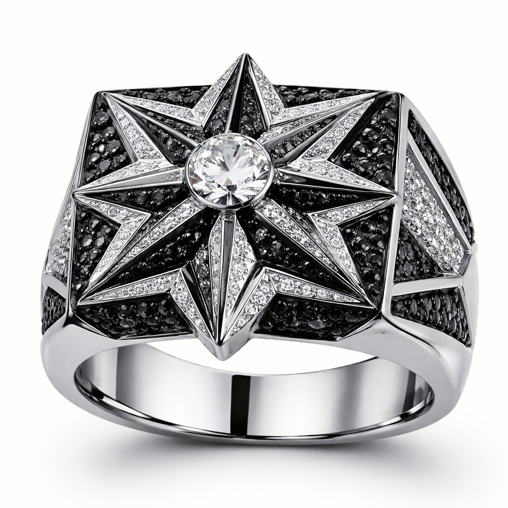 Geomatric star ring of edges and sharp bold shapes of edge of balck and white diamonds for men collection of white background