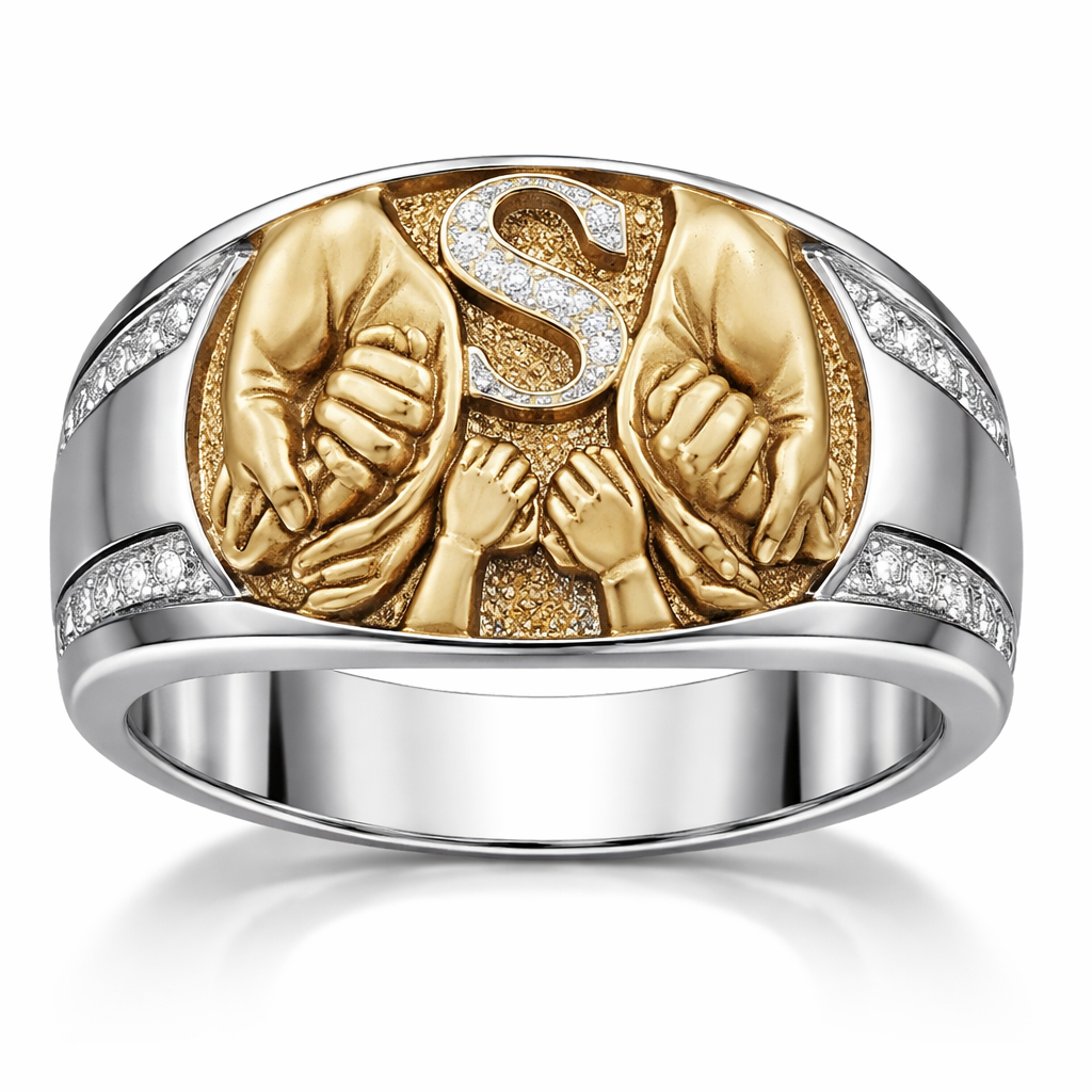 A women's ring. Anillo para hombre con la mano de papa, mamá y 2 manos pequeñas sujetandose de la mano y una letra S atras, modern style