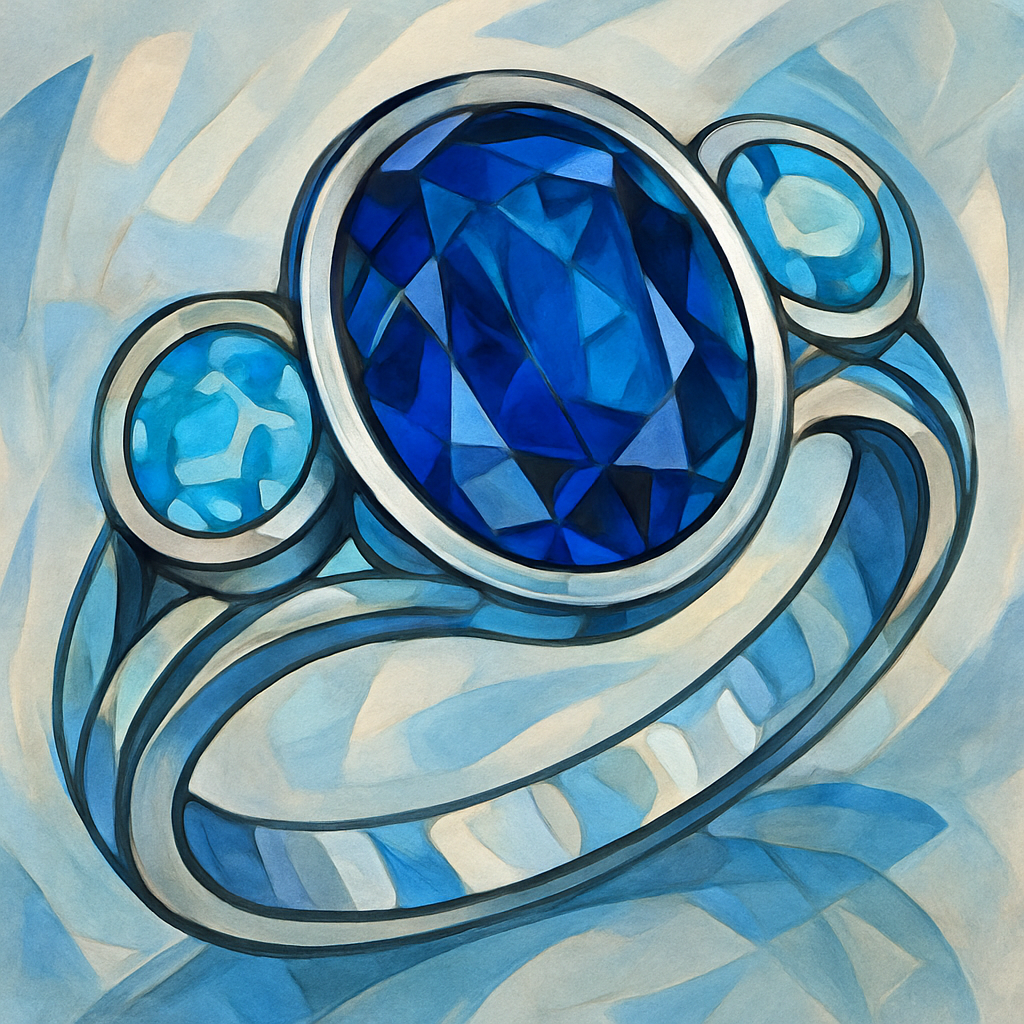 Oval sapphire silver ring with round aqua topaz accent stones , abstract style