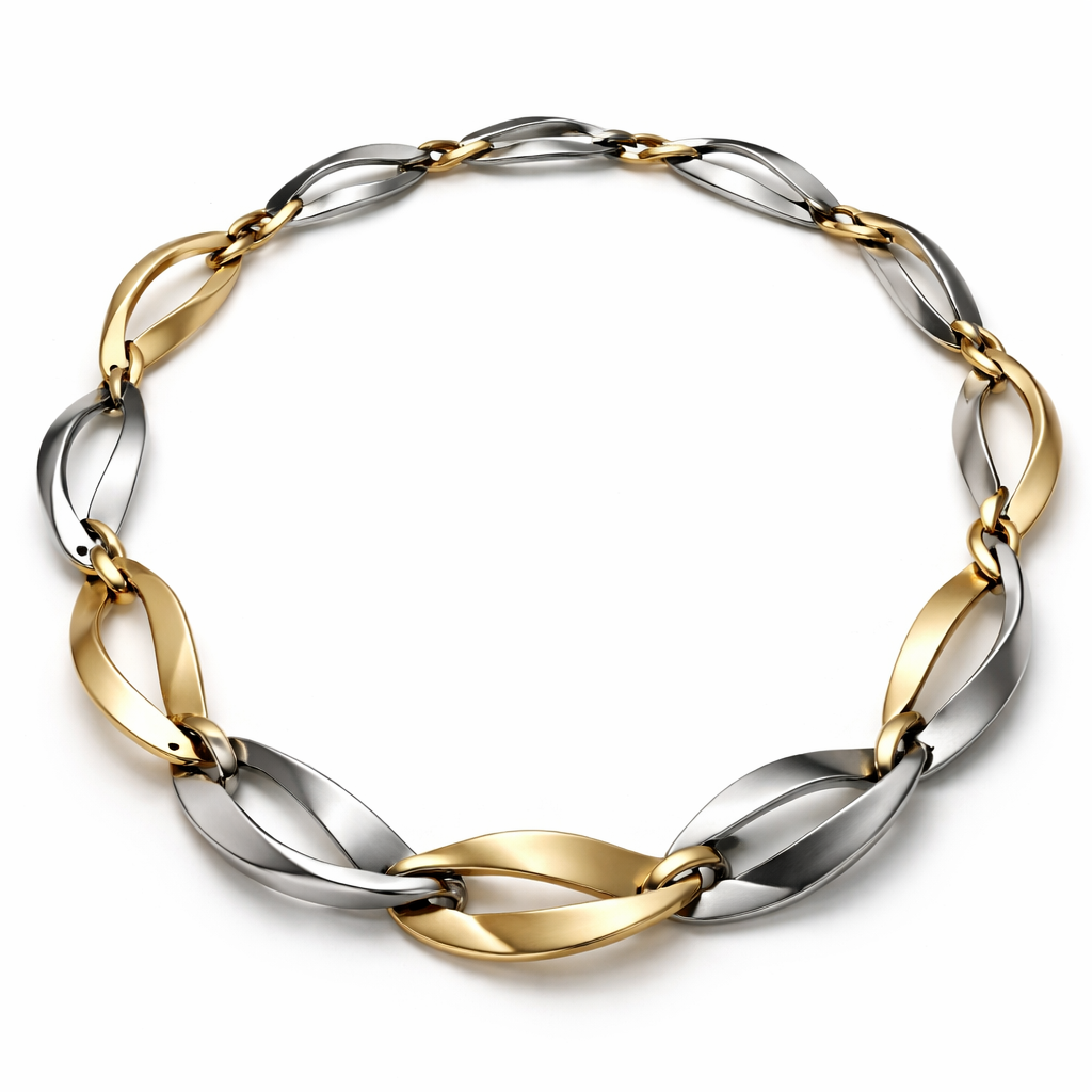A flexible necklace which is not rigid and inspired of twisted flat wire and it has links that connected the pieces with eachother