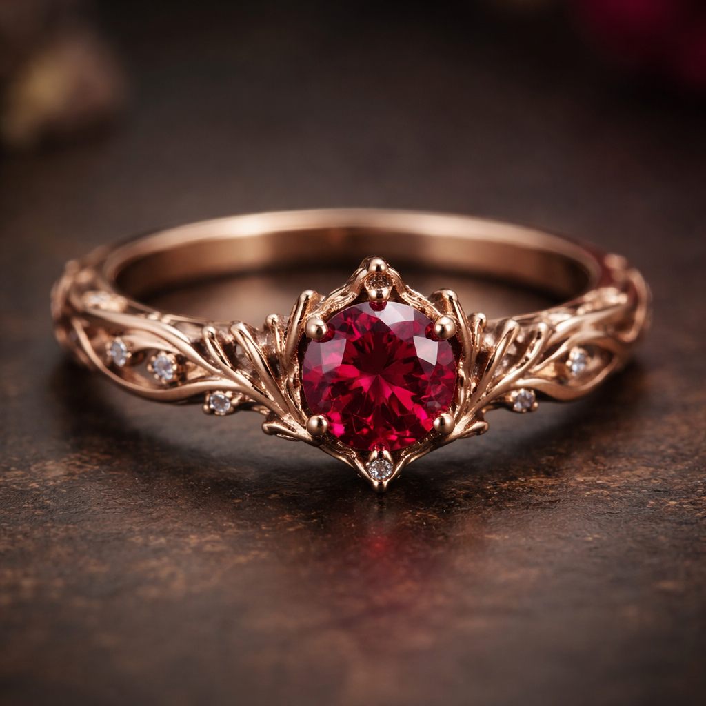 A plain rose gold ring with a ruby , fantasy style