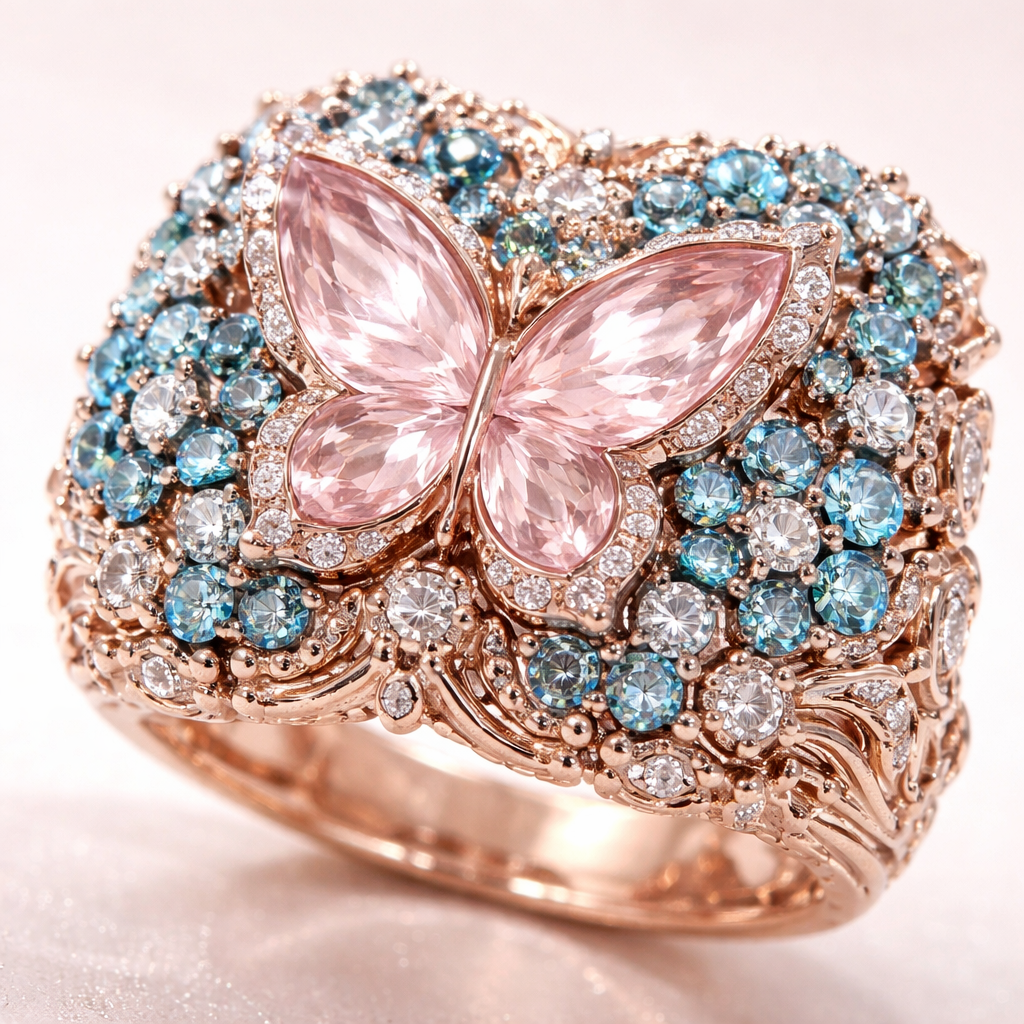 A ring with a light rose pink butterfly shaped gem with hundreds of blue diamond flowers surrounding it and more diamonds surrounded the flowers and rose gold carvings surrounding those gems
