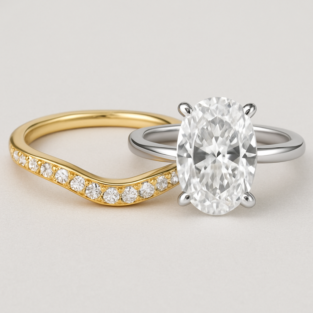 Showcase the yellow gold curved wedding band with pavé diamonds next to the platinum Oval solitaire ring with a claw setting.