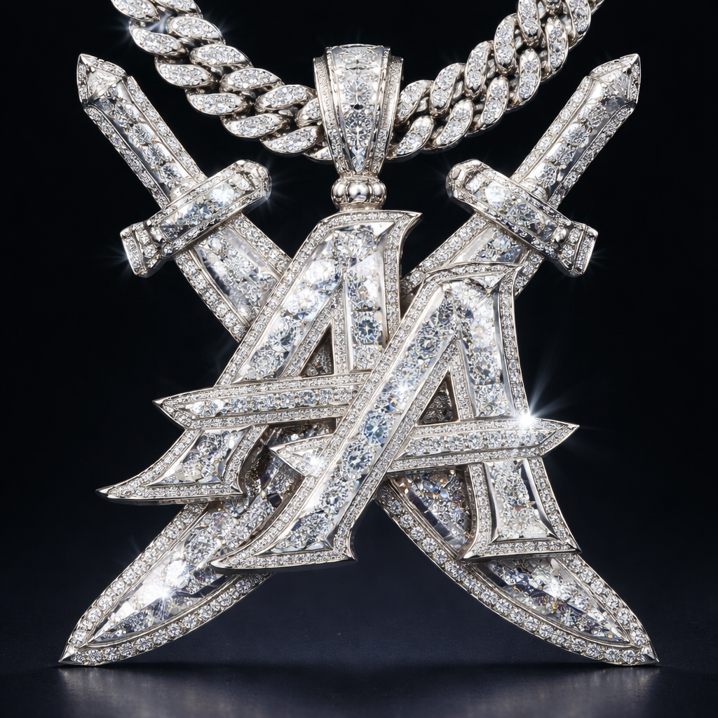 3.5 inch pendant with 2 A’s with 2 crossed swords out of the 2’A VVS DIAMOND BAGUETTE DIAMOND  The Pendant: The pendant features a "one-of-a-kind" design with a mix of . also features unique pyramid-cut jewels and an elevated structure. The piece is flooded with high-quality, brilliant-cut diamonds. The style generally consists of thick, wide, 14k-18k white or rose gold Cuban links completely flooded with VVS natural diamonds. The style generally consists of thick, wide, 14k-18k white or rose gold Cuban links completely flooded with VVS natural diamonds.
