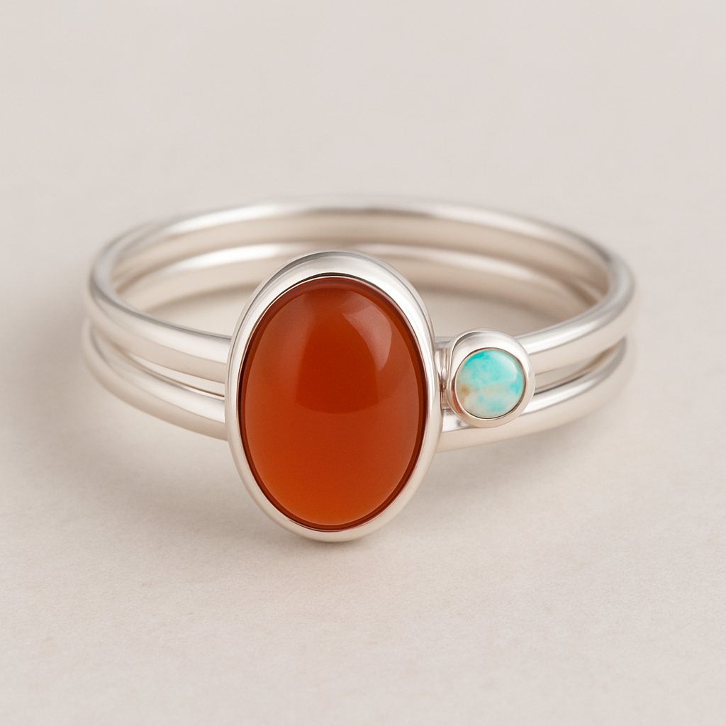 Carnelian oval stone, silver ring with round opal accent, stackable style
