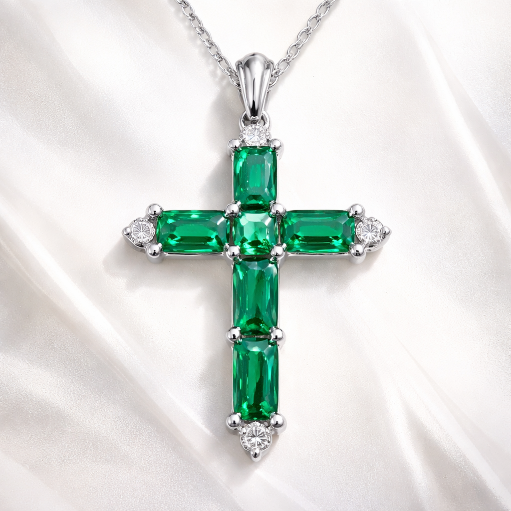 Emerald white gold cross with simple diamond accent stones. Timeless, elegant, and classy , bespoke style