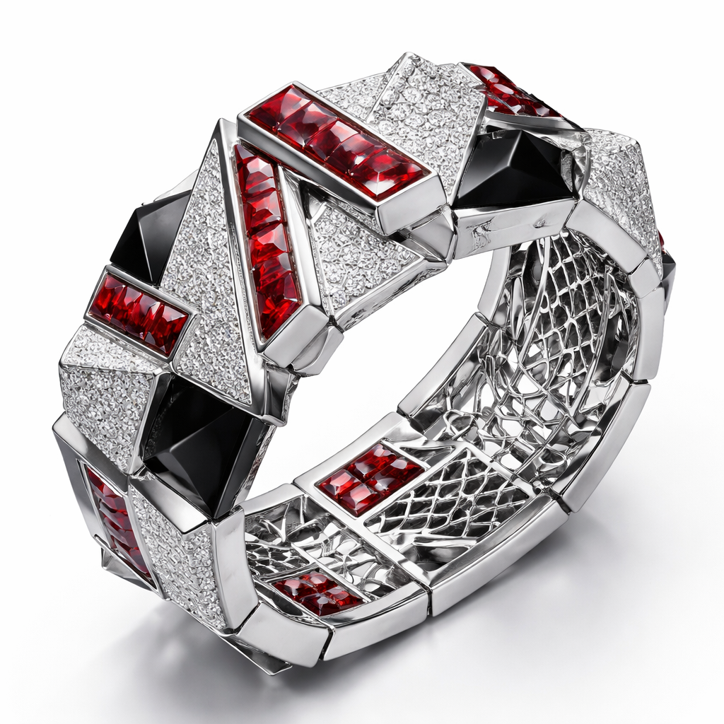 Geomatric shape and architecture shape and voulme of edgy style of bracelet with diamonds and black and rubybof white background